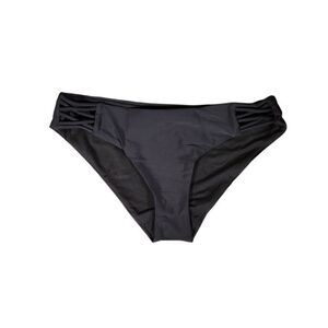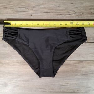 Sashay onto the sands in the Strappy Cheeky Bikini Bottom from Xhilaration. Crisscrossing straps through the hips add a little extra flair to this low-slung black bikini bottom. Pair with a strappy bralette, triangle top or tankini for a look that will have you seriously slaying in the sun. See photos for measurements.