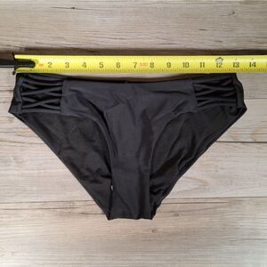 Sashay onto the sands in the Strappy Cheeky Bikini Bottom from Xhilaration. Crisscrossing straps through the hips add a little extra flair to this low-slung black bikini bottom. Pair with a strappy bralette, triangle top or tankini for a look that will have you seriously slaying in the sun. See photos for measurements.