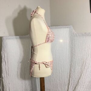 Pink( ish )floral two piece bikini swim set. Ties on the back and back on neck. Pre-owned in good condition. Please refer to pictures for best description and condition verification.