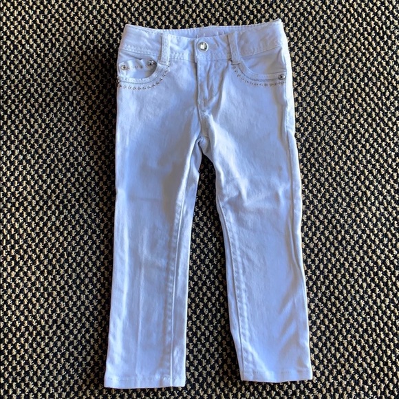Adorable white jeans with jewel buttons. Zip Fly. May wear cuffed. Adjustable waist. One tiny spot - may come out with spot remover.