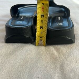 Xhileration black faux leather slip on sandals w/a chunky treated outsole.heal about 2” but overall it is raised a bit so like it’s less.