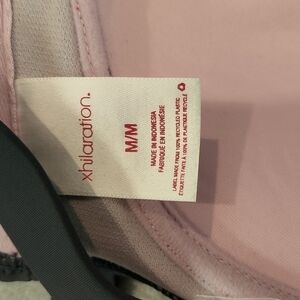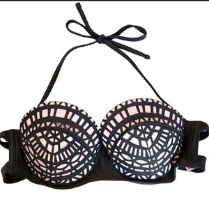 Gray with cutouts that show the light pink under fabric. Neck ties can be removed to make it strapless. This padded peekaboo design is super flattering.