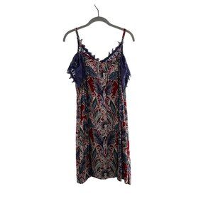 Xhiliration Navy Floral Print Lace-Trimmed Sleeveless Dress L Off Shoulder Boho