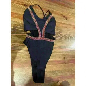 Xhiliration One-Piece Embroidered Beaded Cutout Swimsuit, XL