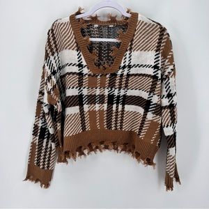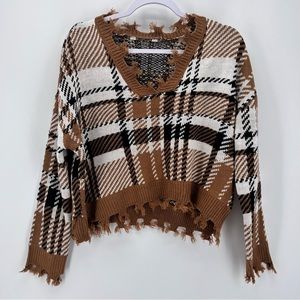 Xhiliration Plaid Tattered Conversation Sweater | Chunky Knit | Distressed| Boxy