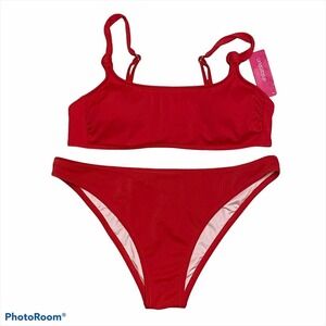 Xhiliration Red Ribbed Square Neck Bikini NWT L