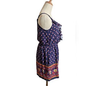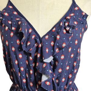 Cute Y2K navy romper with floral print. Features ruffle details and adjustable straps.i see cowboy boots with hat. Feminine and sexy. Stretch waist. Good overall condition