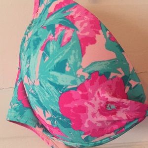 Beautiful bikini halter top features pink floral print with teal palm leaves. Only worn 1 time. Like new. Metal back clasp.
