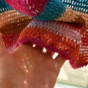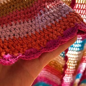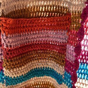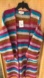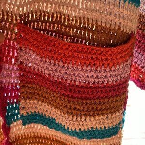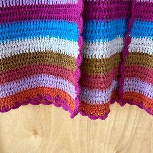 Multi striped, terra-cotta, lilac cream, deep, pink ivory, mustard, with deep pink scalloped trim around cuffs and entire sweater