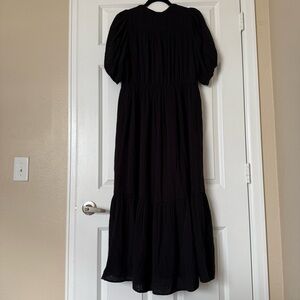 Elegant black midi dress with button-down front. Features short puff sleeves and a flowing silhouette. Perfect for any fall or any ocassion!
