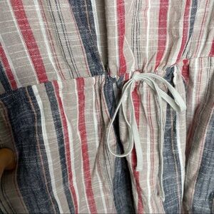 100% cotton, striped knee length long sleeve button up dress, ties around the waist, v-neck,