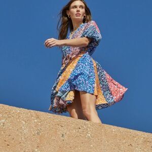 XiRENA dress, Fiesta Lenna dress, ikat print mini dress, silk blend summer dress, boho chic dress, resort wear, vacation style, festival fashion, colorful mini dress, puff sleeve dress, airy cotton silk dress, designer bohemian dress, casual chic outfit, statement print dress, luxury resort wear