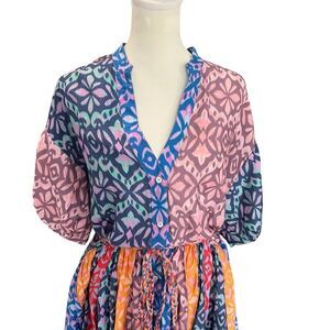 Vibrant and effortlessly chic, the XiRENA Fiesta Lenna Dress is a boho-luxe statement piece perfect for resort wear, summer vacations, and brunch dates. Crafted from a lightweight cotton-silk blend, this dress features a multicolor ikat-inspired print in pink, blue, purple, orange, and teal hues that instantly brighten any look. The V-neckline with button detail, puff half-sleeves, and adjustable drawstring waist create a flattering, relaxed silhouette.