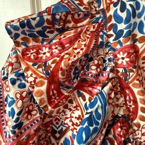 Stylish blouse with multicolor patterns. Features a unique design. Excellent condition. Only worn a handful of times. True to size.