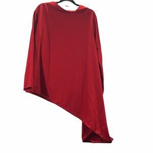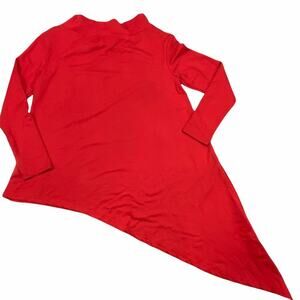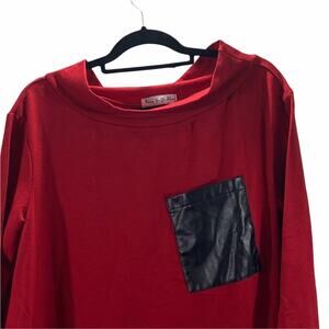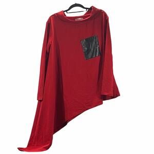 Women's asymmetrical tunic/dress from xiang go yi zhan in red. Black pocket detail on front. Christmas party, pub crawl. Due to light & screen variations, colors may vary slightly from the images