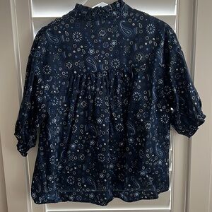 This easy popover has a split V-neck, three-quarter length sleeves, and shirred yoke.