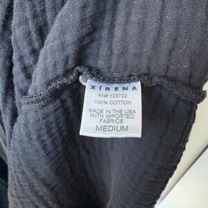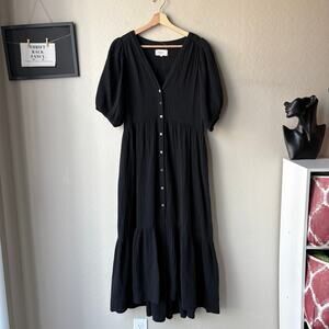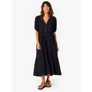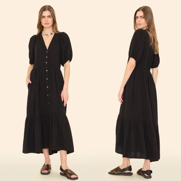 Best selling, "Lennox" dress from Xirena. Cut from a soft cotton gauze, this button-down tiered midi dress slips on for a swingy, easy fit. Side seam pockets. Short sleeves. Midi length. 100% cotton. Solid black. Size medium.