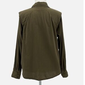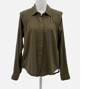 Xirena Edynn Button Front Long Sleeve Cotton Shirt in Agave Green - Size XS. Great pre-owned condition. Cut in Quiana Cotton, the Edynn Shirt has a flange detail and high-low hem. An easy fit, we say buy this one in your true size. 100% Cotton. Machine wash cold, tumble dry low. Made in Los Angeles. Full button front, extra button provided, collared, long sleeves with a double button cuff, shirttail hem. Approximate measurements: 19" pit to pit, 24" front length, 26" back length.