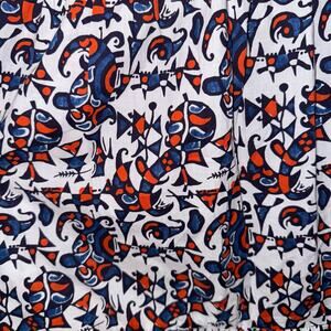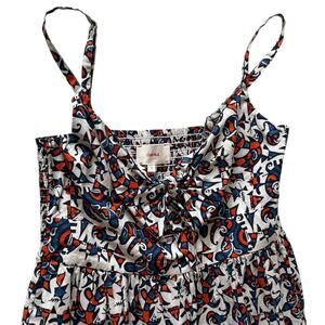 DESCRIPTION: Gently worn "Lolita" dress features an allover multicolor mosaic print. Lolita is a sleeveless spaghetti strap dress with a tiered skirt, cut-out bust, and tie-front detailing.