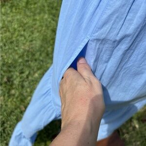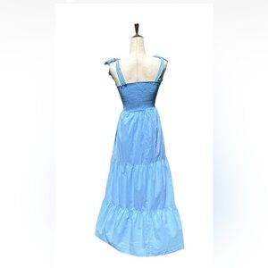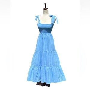 Xirena tiered dress in Cruise Blue. Dainty tiered midi dress with tie straps and a smocked bodice. Squareneck Tie sleeves Sleeveless Pull-on style Side seam pockets 100% cotton Machine wash Made in USA of imported fabric. Size XS. Approximate measurements laying flat are pit to pit unstetched 11", length from bottom of shoulder strap to bottom hem 43”.