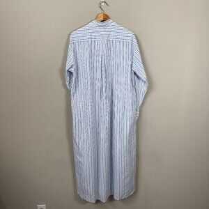 The Xirena Marlowe Coastal Stripe Midi Shirt Dress in size small is a stylish and versatile piece perfect for various occasions including travel, parties, and casual outings. Made from 100% cotton, this dress features a striped pattern in white and blue, with a collared neckline and long sleeves. The pullover closure and barrel sleeves add a touch of preppy style, while the midi length and high waist offer a flattering silhouette. Lightweight and machine washable, this dress is ideal for the summer, fall, and spring seasons, making it a must-have addition to any woman's wardrobe. Belt not included.