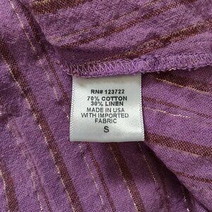 Lavender and gold textured striped woven (70% Cotton, 30% Linen). Maxi. Sleeveless. Scoop neckline. Exposed back tie straps closure. Made in the USA.