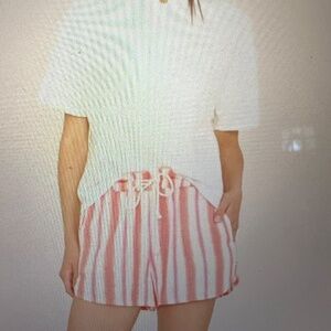 NWT Xirena Starla striped 100% cotton gauze shorts from 2025 Spring/Summer season. Size M. Colors off white, pink, coral/cantalope. Starla is a Dlolphin short with an elasticized drawstring waist and side seam pockets. Perfect for a summer day. Purchased in April 2025 from Xirena for $150. Selling for $50