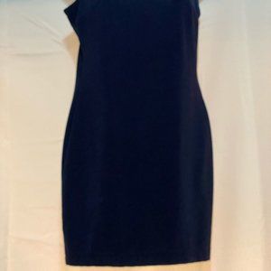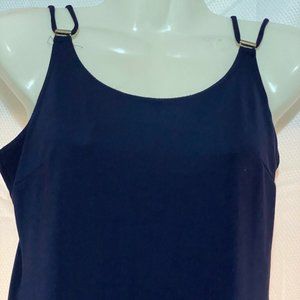 Hanging spaghetti strap on gold coated aglet hardware. Navy blue.