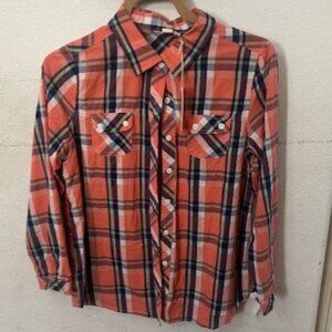 Xiu Yi Fang Women's 42 Shirt Button Down Orange Melon Plaid 100% Cotton NWT