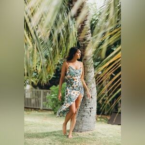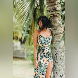Tropical dreams! The Havana Slit Midi Dress is everything with its fun allover tropical leaf and spot print, v-neckline, midi length, adjustable straps, and hidden back zipper closure. She also features a flattering and sassy front slit for extra cuteness!
