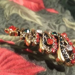 Pretty gold tone Christmas Tree pin. Gold swirls wind their way around the tree along with red and green rhinestones shine as balls hanging from the tree. This tree measures 1 1/2" tall. It will compliment all your holiday attire. It will arrive in it's own organza bag.