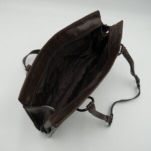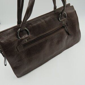 Durable shoulder bag featuring studded accents, a zippered main compartment, and a convenient back pocket. A stylish and functional accessory.