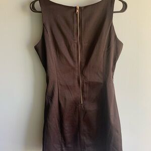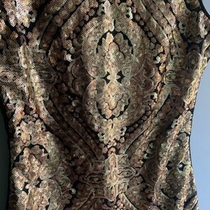 sleeveless dress features gold & bronze/copper sequins. on a black background and a chic matching exposed gold rear zipper.
