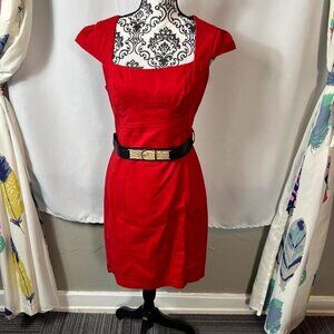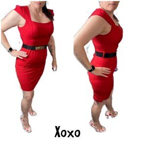 Perfect for the holidays, a wedding or even work. XOXO bright red bodycon pencil dress. Square neckline. Back zipper closure. Paneled. Cap sleeves. Black snap belt included. Top is lined. 70% cotton 28% nylon 2% spandex. Lining 100% polyester. Size 11/12