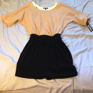 Beautiful dress brand new with tags! Gold detail around neck and racerback and cross back. Tan and black dress.