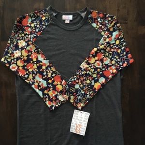 Dark gray body, printed sleeves with a navy background