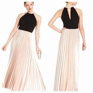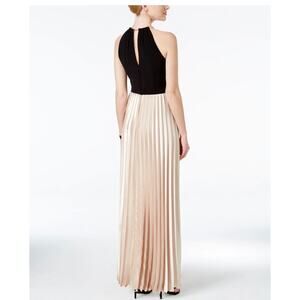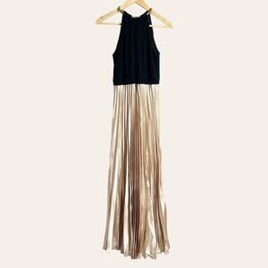 Xscape Black Champagne Gold Pleated Sleeveless Halter Maxi Gown Dress Size 4