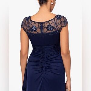 Xscape Beaded Yoke Cap Sleeve Illusion Round Neck Ruched Cascade Ruffle Side Gown in Navy