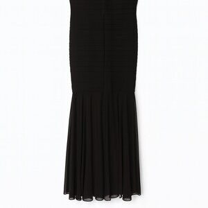 The dress has a long, sleek silhouette with a softly flared hem and a flowy chiffon-style finish at the bottom for movement. A great option for formal events, weddings, galas, cruises, or mother-of-the-bride/groom occasions.