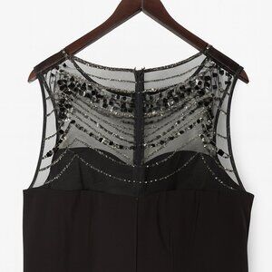 Elegant Xscape formal dress in classic black with a striking embellished illusion neckline. The upper bodice features sheer mesh with beadwork in a geometric pattern, creating a sophisticated “illusion” look while still offering coverage.