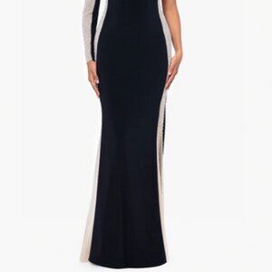 Xscape Black Nude Bead Detail Long Sleeve One Shoulder Gown