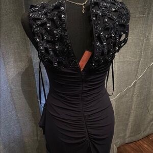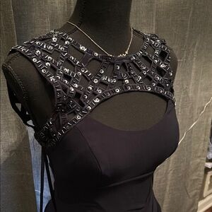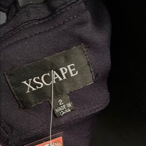 This elegant Xscape dress showcases a sophisticated black hue with a chic halter neckline and a bodycon silhouette. The ruched detailing enhances the form-fitting design, while the embellished accents add a touch of glamour, making it ideal for a cocktail event.