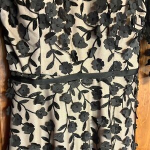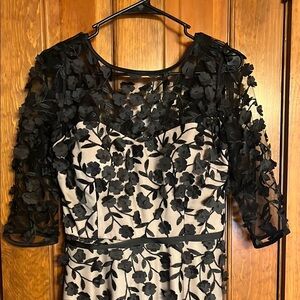 This elegant gown by Xscape showcases a black lace overlay on a tan underlay, highlighted by a sweetheart neckline and 3/4 sleeves. Perfect for cocktail events or as a wedding guest, the gown's flowing silhouette exudes sophistication and grace.