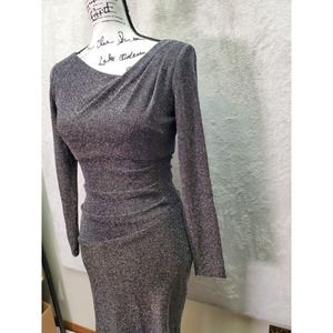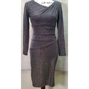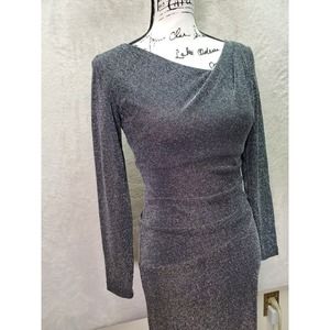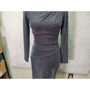 Xscape Bodycon Dress Womens Size 4 Silver Glitter Asymmetrical Neck Back Zip EUC