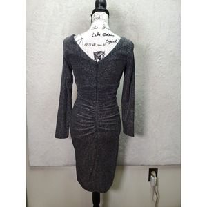 Xscape Bodycon Dress Womens Size 4 Silver Glitter Asymmetrical Neck Back Zip EUC.