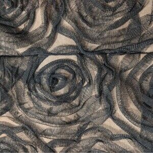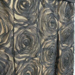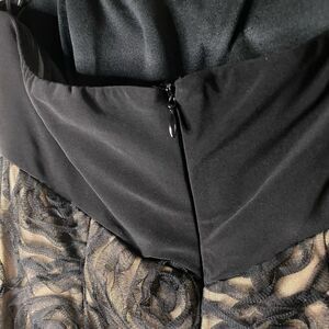 Black and nude cocktail dress from Xscape By Joanna Chen. Black bodice with black mesh rosettes over nude. Elastic at back of bodice. Size 8. Approximate measurements-Bust: 16" across from armpit to armpit. Length: 32". New with tags.