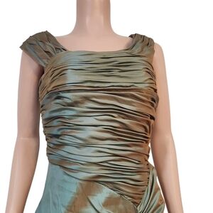 Xscape By Joanna Chen Ruffle Greenish Gold Ruched Maxi Tail Tafetta Dress Sz 10