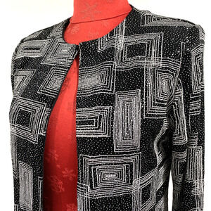 Xscape Cocktail Jacket cropped crew neck black stretch with silver metallic details in US size S. Gorgeous lightweight classic look - acetate spandex with polyester lining that you can hand wash as desired. Hook & eye clasp at the neck - long open front - thick shoulderpads. Perfect for any dressy event. Gently worn - no flaws.