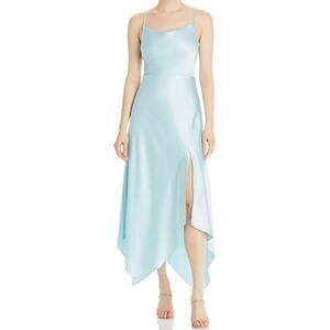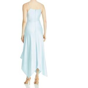 Xscape Satin Dress 4 Blue Handkerchief Hem Asymmetric Drape Slit Midi Sleeveless Party Wedding Cocktail Formal Evening Bridesmaid Holiday Christmas Event