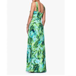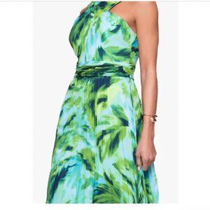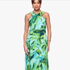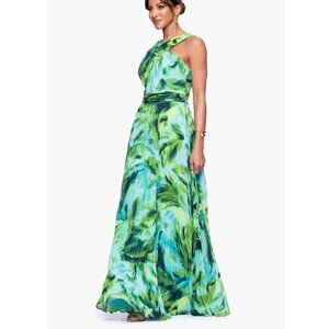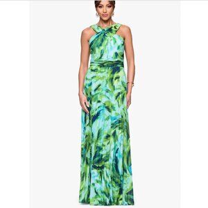 This dress is SO beautiful and very sadly a tiny bit too small at the busy for me. It's got the most beautiful shades of aqua, blue, and green. Never worn, new with tags. The brand is Xscape and the specific style is the Casey. It's got a pretty crisscross halter neckline and a straight back. I'm 5'10" and it goes almost all the way to the floor for me. When I put on a 2" heel it hit about 1" above the floor. Fits like a true 8. Ships quickly from Fort Worth, Texas.